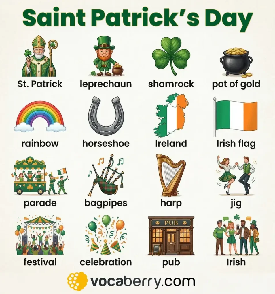 Saint Patrick’s Day is a popular cultural and religious holiday celebrated on March 17, especially in Ireland and many English-speaking countries. During this holiday, people enjoy parades, Irish music, traditional food, and green decorations. In this guide, you will learn common Saint Patrick’s Day vocabulary in English with clear meanings and example sentences.